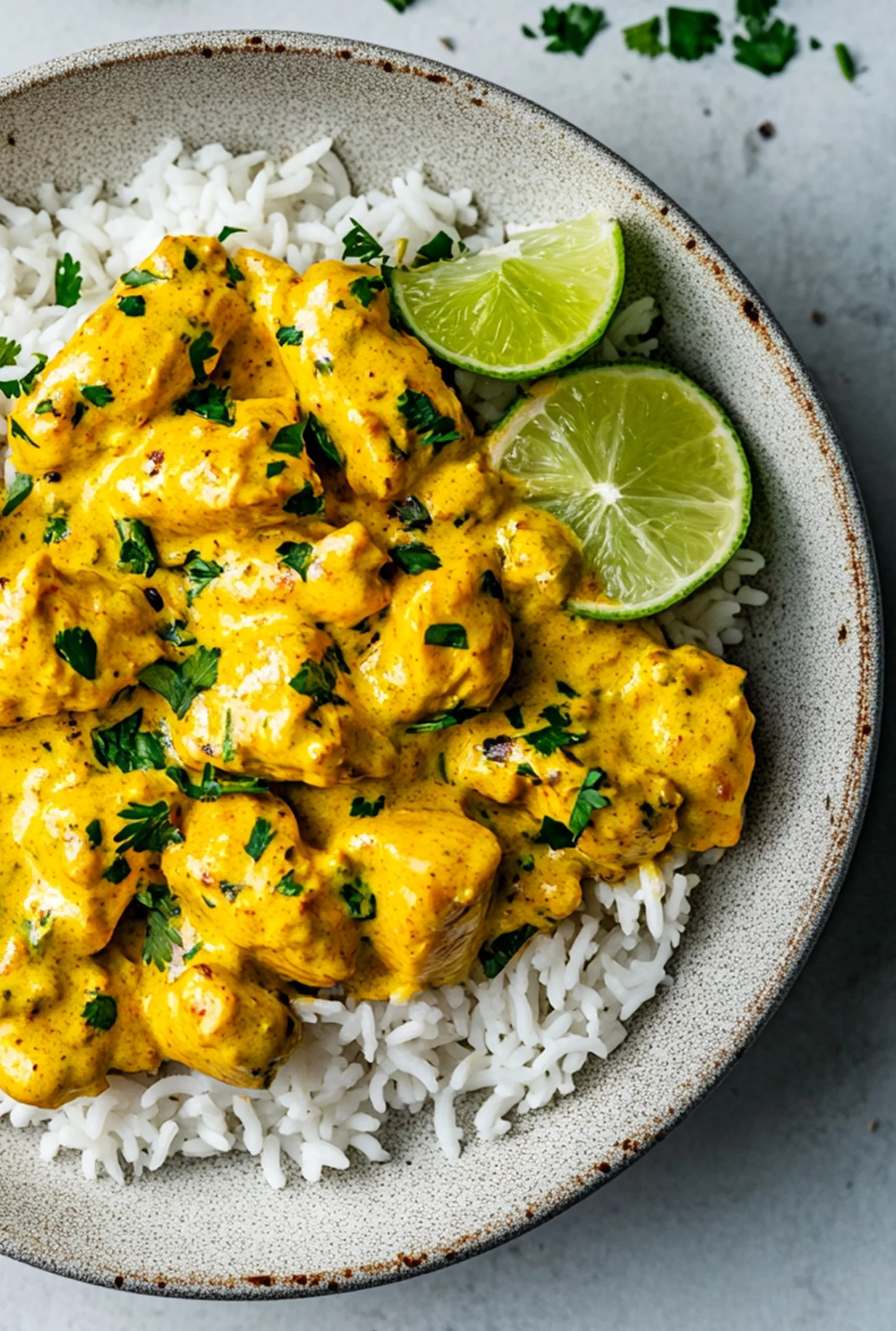 - Hindistan cevizli tavuğu pişmiş pirincin üzerine koyun. Taze kişniş veya fesleğenle süsleyin ve yanında lime dilimleri ile servis edin.