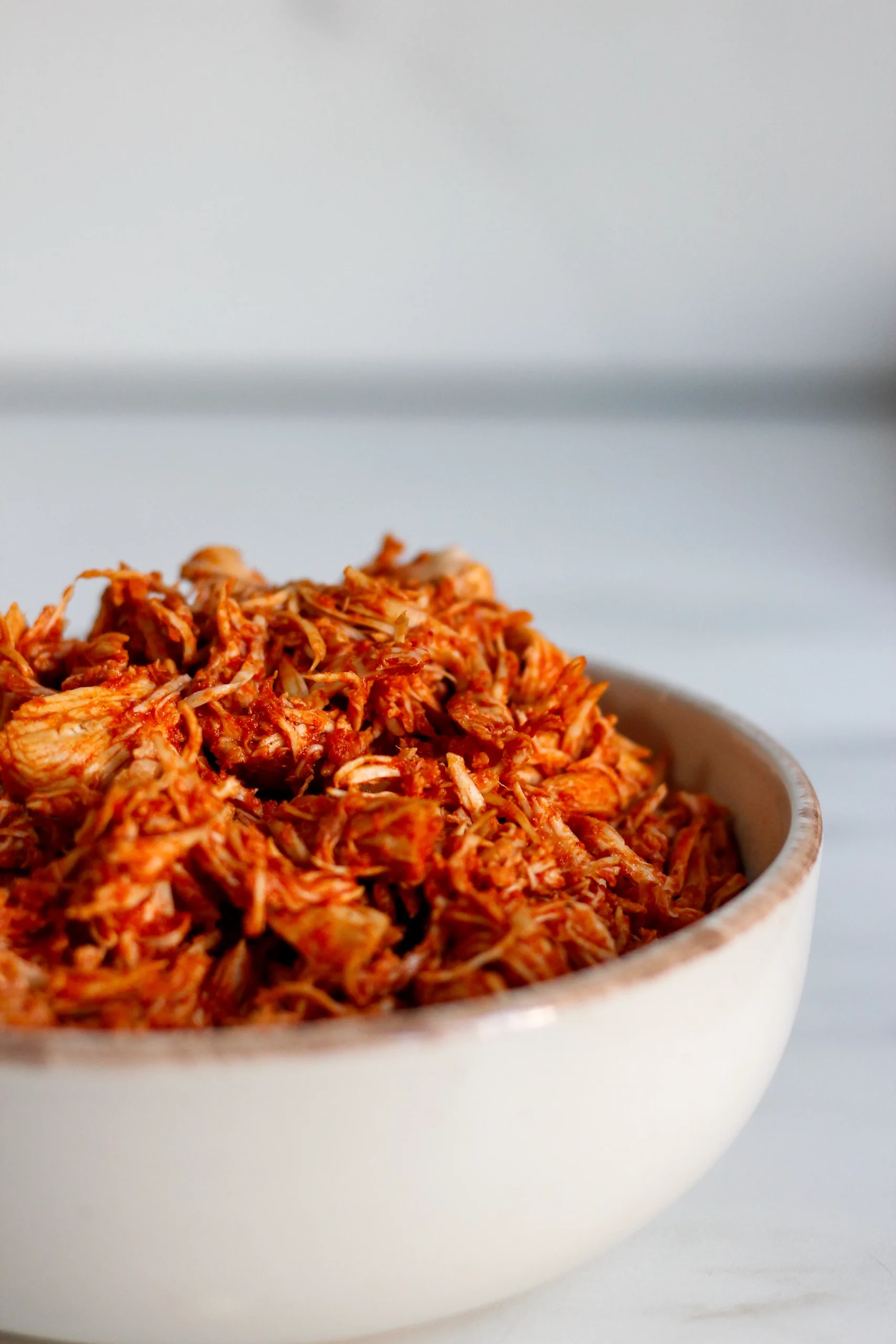 - Tavuk fırından çıkarın ve iki çatal kullanarak didikleyin. Didiklenmiş tavuğu tekrar kaba ekleyin ve kalan sos ile karıştırın.